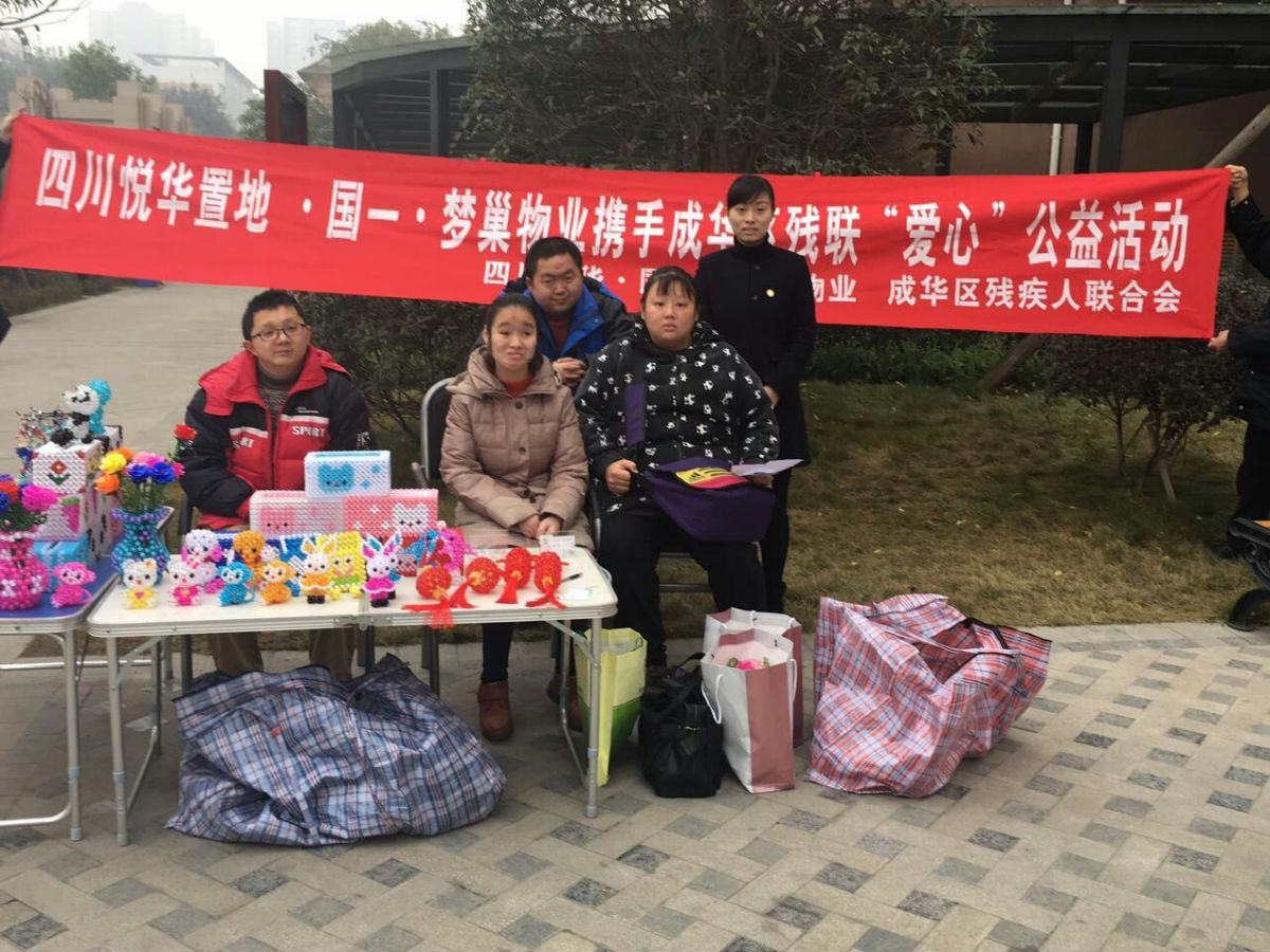 1月6日-2月10日,区残联组织“阳光家园”老师及学员前往“国一梦巢”参加由四川悦华置地物业有限公司承办的义卖活动。