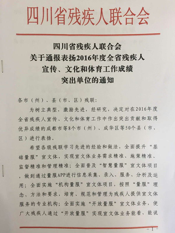 近日,成华区残联被评为“2016年度四川省残疾人宣传、文化和体育工作成绩突出单位”,受到省残联通报表扬。