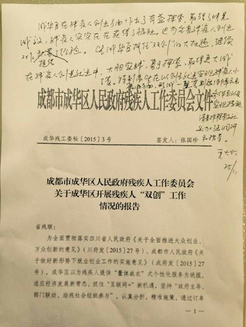 11月25日,四川省残疾人联合会对成华区开展“大众创业、万众创新”工作给予高度肯定。省残联毛大付理事长在成华区人民政府残疾人工作委员会《关于成华区开展残疾人“双创”工作情况的报告》中批示:成华区在残疾人创业方面作出了有益探索,取得了明显成效,残疾人实实在在获得了福祉,也为全省残疾人创业工作提供了经验。希望成华区抓住“双创”的大机遇,继续在残疾人创业就业中,大胆实践、勇于探索,取得更大成绩。特别希望在以创业就业实现残疾人小康方面,形成“一整套制度保障和服务体系以及实现措施”。