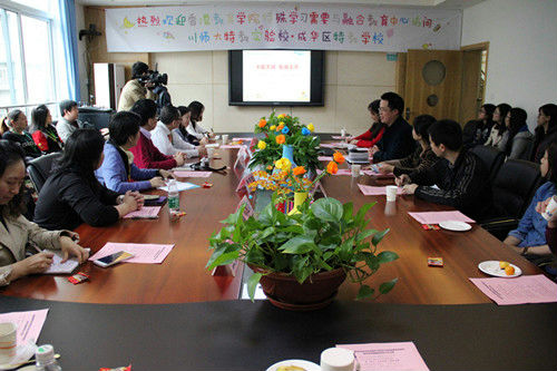 3月31日下午,香港教育学院特殊学习需要与融合教育中心总监冼权锋教授带领专家、学者和大学生一行近40余人走进四川师范大学特教实验校?成华区特殊教育学校开展中港特教学术交流活动。成华区教育局党组成员、纪检组长贺晓斌、川师大教育科学院吴春燕博士、重庆渝中区特教学校副校长汪安琼等相关领导莅临参加。