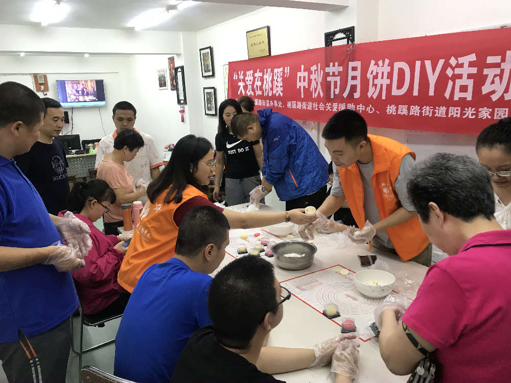 9月11日下午,桃蹊路街道社会关爱援助中心联合桃蹊路街道“阳光家园”共同举办了“关爱在桃蹊”中秋节月饼DIY活动,为服务对象及其家人提供一个DIY月饼的舞台,让他们在自己动手做月饼的过程中,体会到合作、沟通、集体活动带来的快乐。期间,社区工作者还向学员们演示并教授了冰皮月饼的诞生过程。学员们感到活动既好玩、又“好吃”,大家在学中玩、玩中学,不亦乐乎,度过了一个非常开心的中秋节。