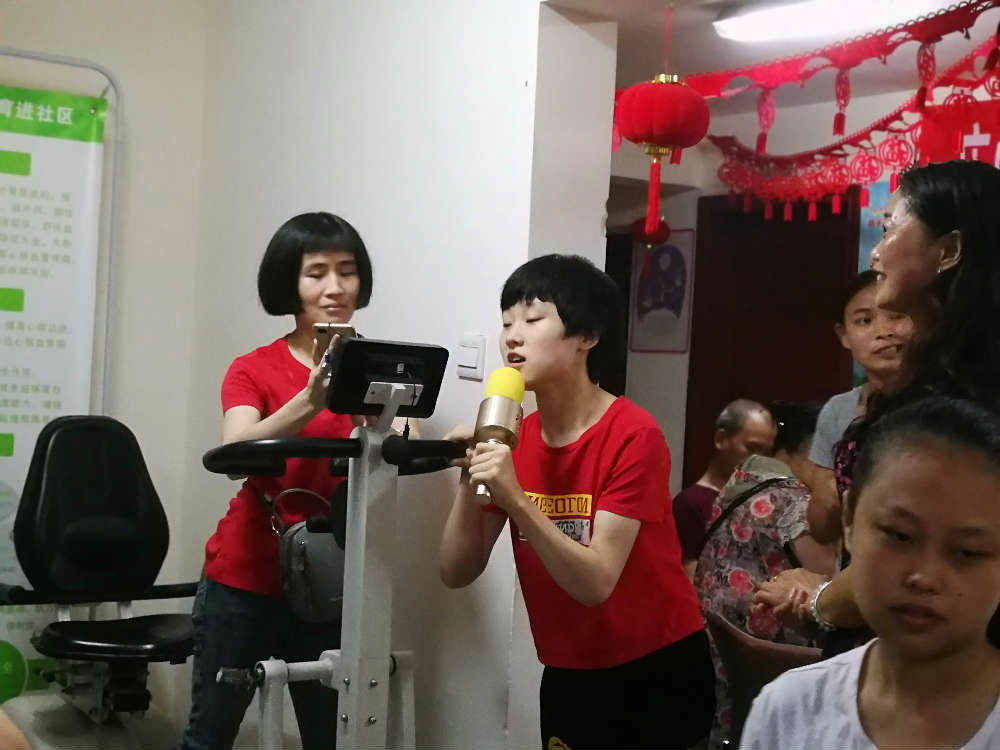 白莲池街道“阳光家园”学员林征宇在妈妈的陪伴下演唱《我爱我的祖国》