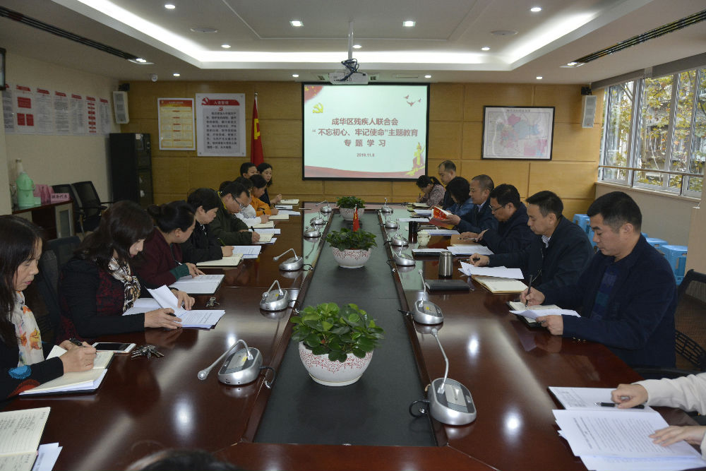 2019年11月8日下午,成都市成华区残联召开“不忘初心、牢记使命”主题教育专题学习会。区残联党组书记、理事长韦华,党组成员张明波,党组成员、副理事长严旭松,副调研员邹宗良出席会议。区残联机关全体党员干部职工参加会议。会议由韦华同志主持。