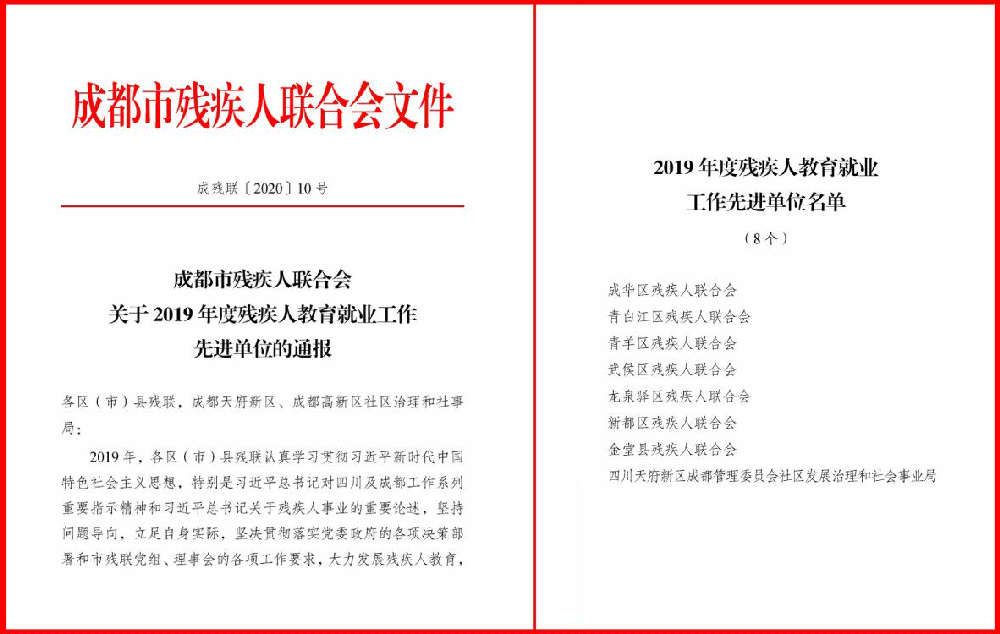 近日,区残联残疾人工作、创新工作、教育就业工作、精准康复工作和宣传文化体育工作等五个方面工作被成都市残联表彰为先进单位,受到通报表扬。