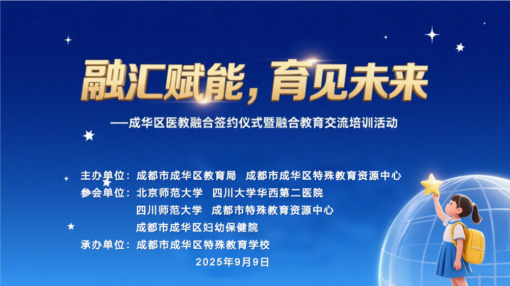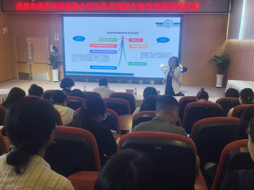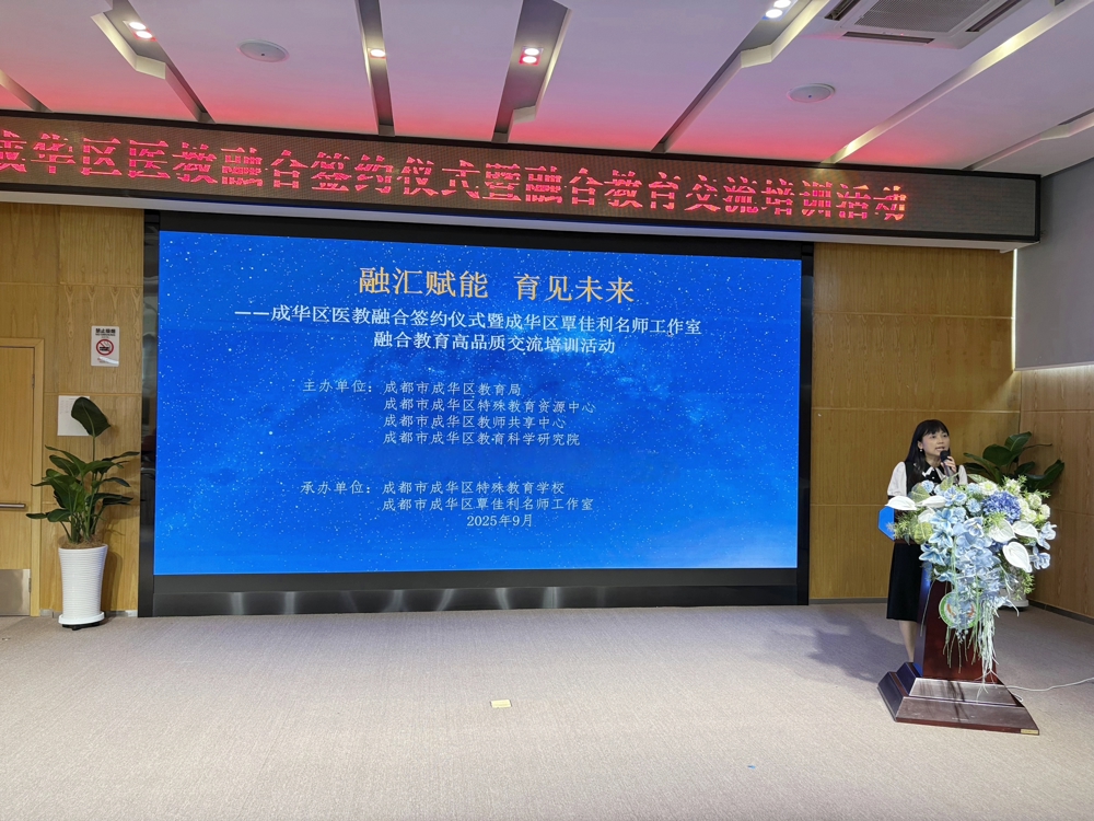 为深入贯彻国家《“十四五”特殊教育发展提升行动计划》精神,深化区域融合教育改革,全面展示成华区在特殊需要儿童“医教融合”、“普特融合”领域的实践成果,9月9日,由成都市成华区教育局、成都市成华区特殊教育资源中心联合主办,成都市成华区特殊教育学校承办的“融汇赋能 育见未来”医教融合签约仪式暨融合教育交流培训会在成都市成华区特殊教育学校举行。来自市区教育主管部门、高等院校、医疗机构及区内中小学、幼儿园约150名代表齐聚一堂,共探特殊教育高质量发展新路径。此次活动分为上午场和下午场,上午场由区特教学校青年教师顾立主持,下午场由区特教学校综合处副主任何丹主持。