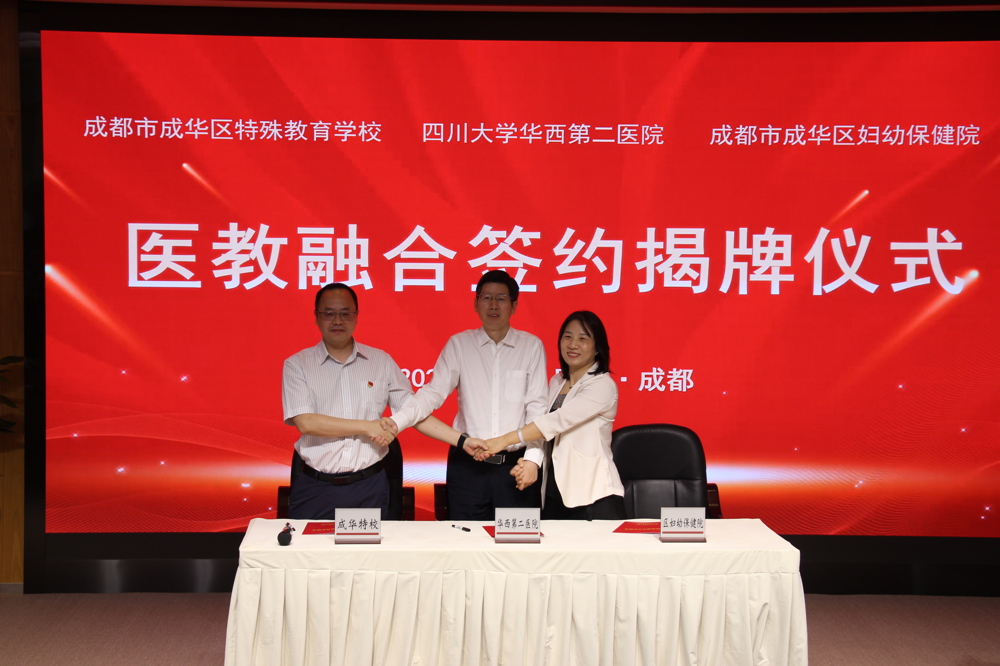 随后,签约仪式正式启动。四川大学华西第二医院、成都市成华区特殊教育学校、成都市成华区妇幼保健院三方代表共同登台,在现场嘉宾的见证下郑重签署医教融合合作协议,这标志着成华区在特殊教育“医教融合”实践中,迈出了从理念探索到落地实施的实质性一步。协议签署完毕,出席活动的领导共同为本次医教融合合作项目揭牌。