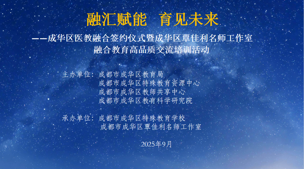 此次“融汇赋能 育见未来”医教融合签约仪式暨融合教育交流培训会的成功举办,凝聚多方智慧与力量,搭建起“教育—医疗—高校”三方协同合作平台,为成华区融合教育从“覆盖式”向“提质式”转型注入新动能。成华区特殊教育资源中心将以此次活动为契机,持续推进医教资源深度整合,不断完善融合教育支持体系,推动区域特殊教育事业在新征程上谱写更加绚丽的华章。