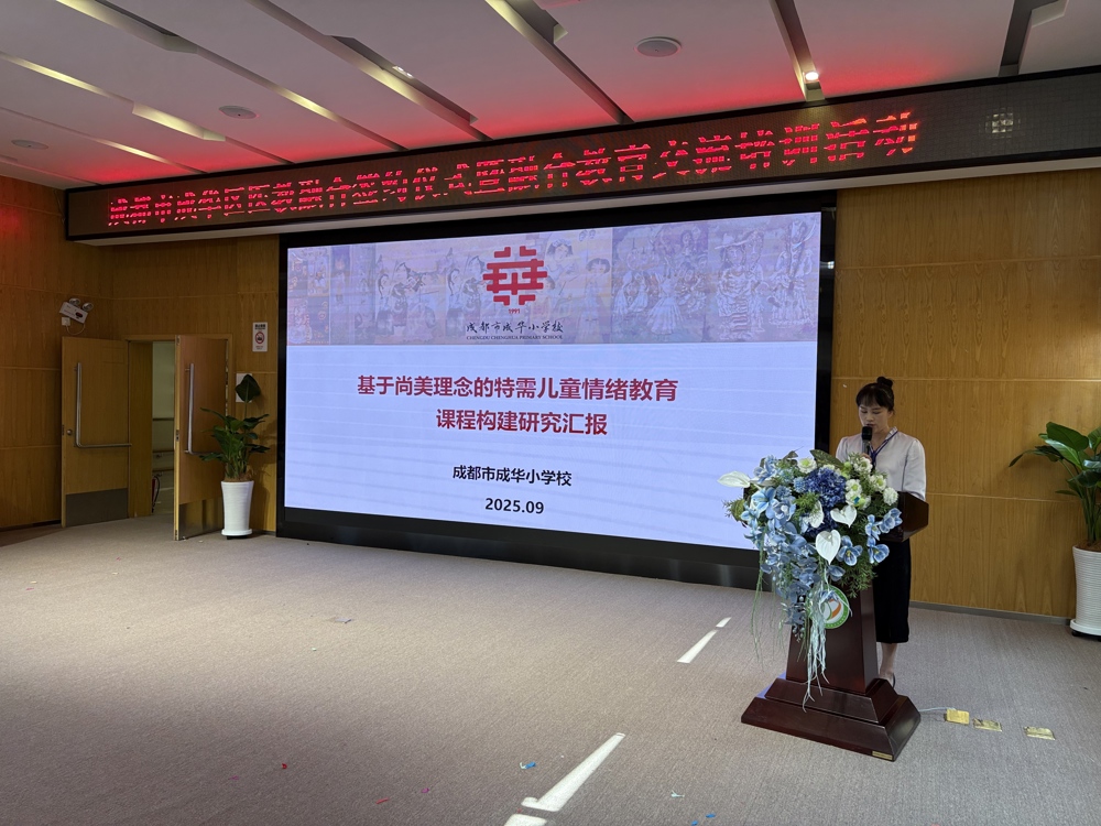 “课题研究分享”分论坛在四楼阶梯教室举行,4 所学校依次分享融合教育实践课题成果。成都市成华小学校邱晋雯以《基于尚美理念的特需儿童情绪教育课程构建研究》为题进行了分享。
