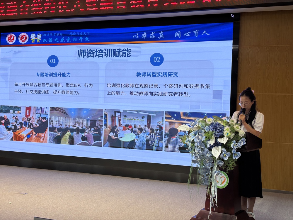 成都双语实验学校刘鑫老师以《提升社会性融合的双向赋能行动——成都双语实验学校融合教育“星河树成长计划”探索》为题进行了交流。