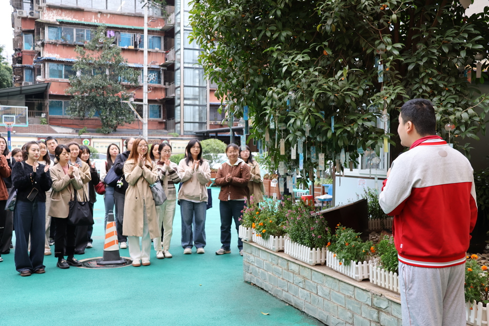 踏入校园,教师们在小小讲解员与学校行政团队的联袂引领下,拉开了跟岗研修的序幕。讲解员们精神饱满地介绍了校园的环境创设:寄托美好期许的心愿树枝繁叶茂、憨态可掬的休憩区温馨雅致、孕育希望的种植区绿意盎然,一步步将校园的独特意趣与教育温度铺展开来。