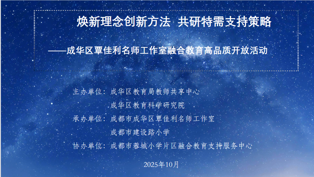 教育的温度,是让每个生命都被看见、被滋养;融合的美好,是让每颗“星星”都被接纳、被照亮。为深化广义特需学生支持工作,由成华区教育局教师共享中心、成华区教育科学研究院主办,成华区覃佳利名师工作室、成都市建设路小学承办,成都市蓉城小学片区融合教育支持服务中心协办的“焕新理念创新方法 共研特需支持策略”活动,于2025年10月31日下午在成都市建设路小学温暖启幕。