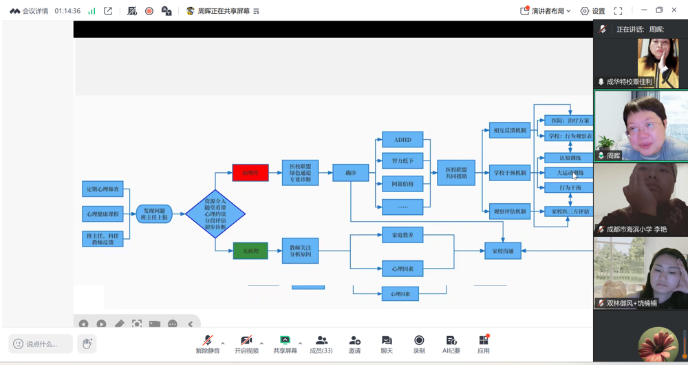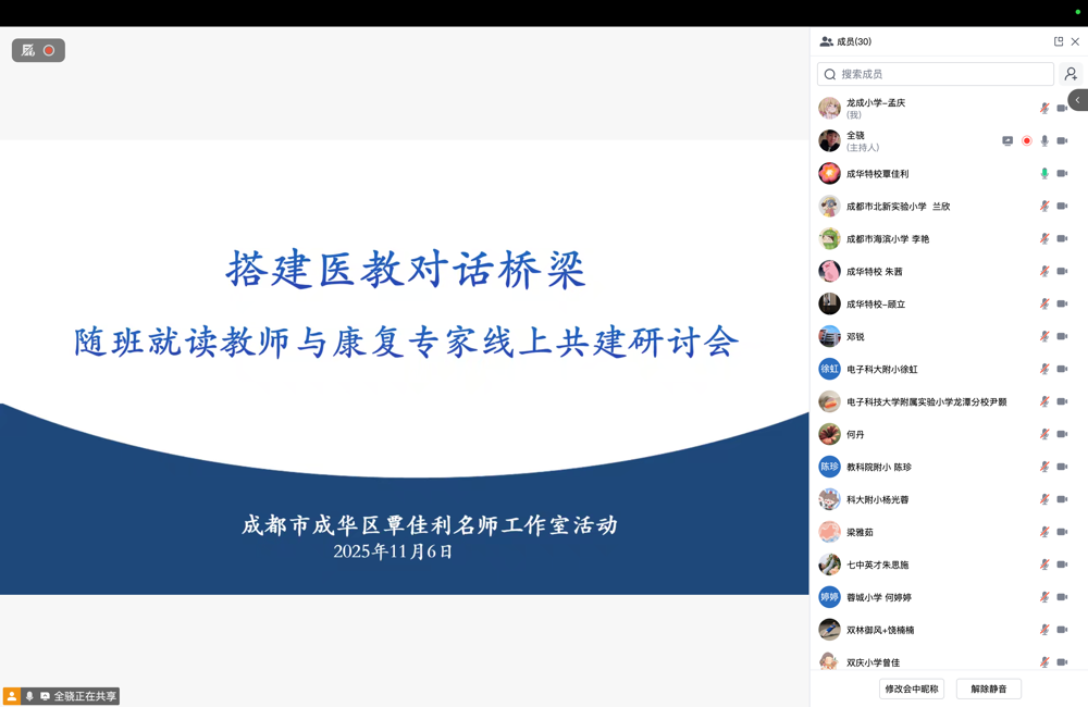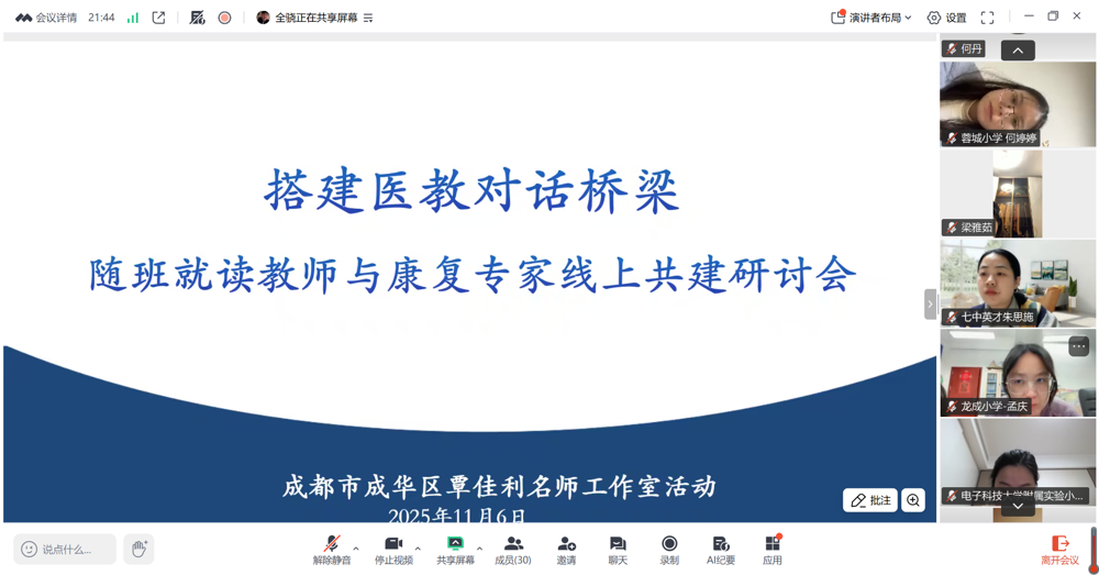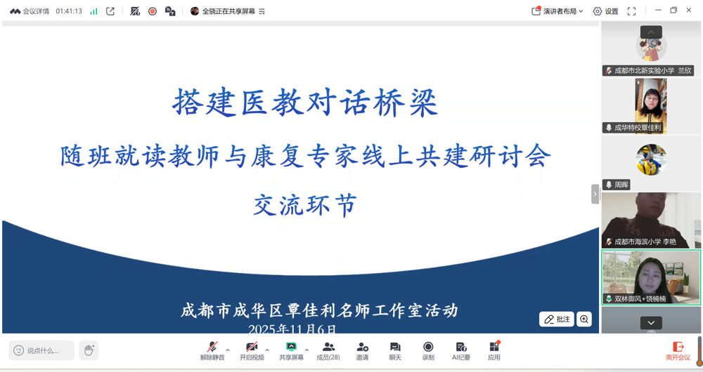 为深入贯彻《“十四五”特殊教育发展提升行动计划》及《教育强国建设规划纲要(2024-2035年)》关于“推动普通教育、医疗康复与特殊教育进一步深度融合”的战略要求,响应成都市成华区正在实施的 “医教融合三年规划” 。11 月 6 日晚,由成华区覃佳利名师工作室精心策划的 “搭建医教对话桥梁”线上培训研讨会如期举行。本次活动邀请四川大学华西第二医院儿童康复科主任医师、医学博士、硕士生导师周晖与工作室全体教师、区域随班就读教师代表、特教学校教师代表等云端相聚,共同探寻特殊需要儿童的成长密码,推动医教融合从理念走向实践。