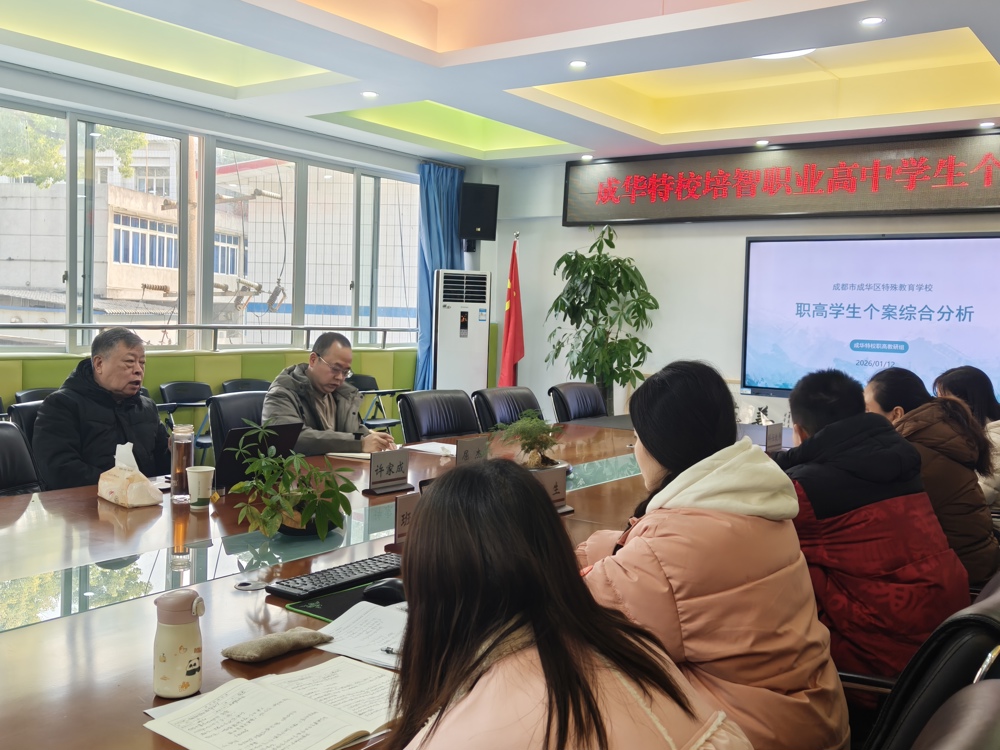 为深入践行“以生为本”的特殊教育理念,科学规划学生职业发展路径,2026年1月12日,成都市成华区特殊教育学校为职高二年级刘同学组织召开了个别化职业教育支持计划(IVESP)综合分析会。会议特邀国内知名特殊教育专家许家成教授莅临指导,学校党支部书记、校长屈杰,副书记、副校长覃佳利,课程研发中心副主任廖芳,职高教师团队、家长及学生本人共同参与,通过多维度剖析与多视角研讨,共同描绘学生未来的支持蓝图。
