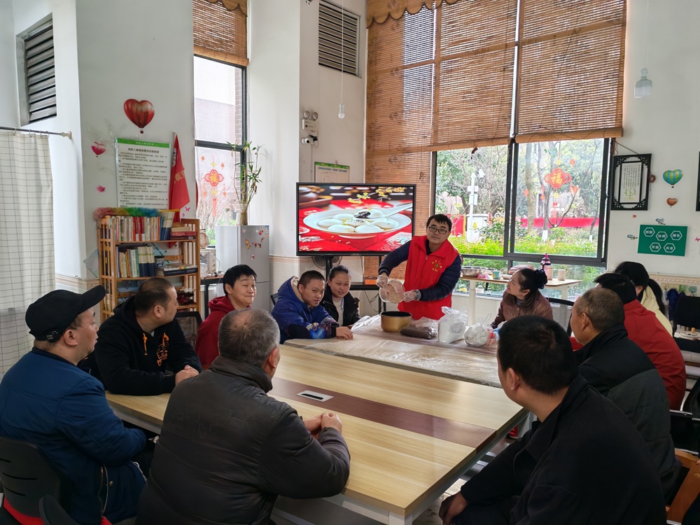 欢乐有趣的“亲手搓幸福”汤圆制作活动分别在区级阳光家园、府青路、万年场、龙潭等街道开展,吸引了学员及学员亲属参与。学员们或表演节目,或认真布置家园环境,或对家人送上温暖拥抱,或为朋友送上诚挚祝福,活动现场温馨祥和。管理服务人员提前精心准备糯米粉、花生米、红糖等食材,耐心讲解揉面、包馅、搓圆等制作技巧。学员们认真学习,积极实践,搓出的汤圆虽然形态各异、大小不一,但大家脸上洋溢的笑容却是一样的温馨甜蜜。活动让学员们在互动中增进了彼此交流,感悟了传统年俗乐趣。