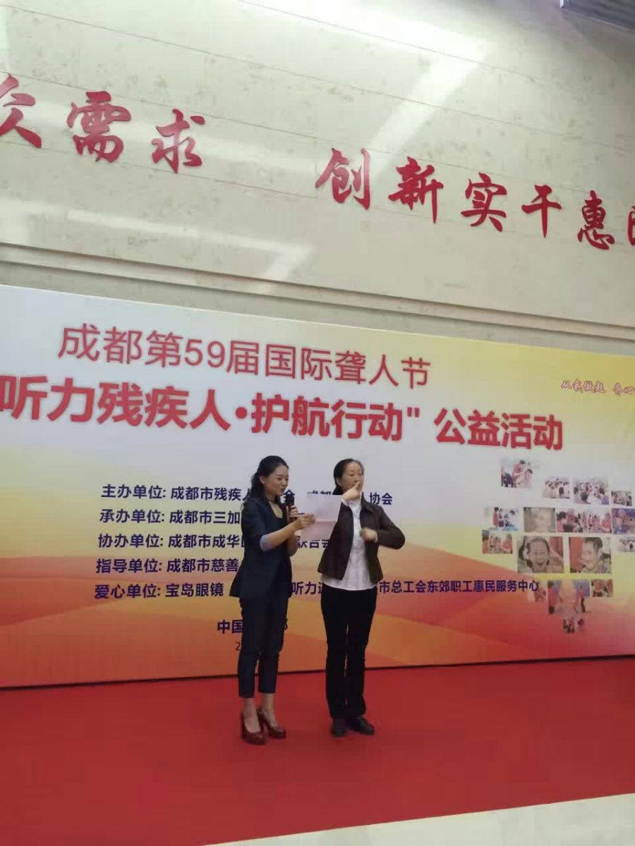 9月23日,由市残联、市聋协主办,区残联协办的成都第59届国际聋人节“关爱听力残疾人·护航行动”公益活动启动仪式在成都市东郊惠民中心举行,市残联分管副理事长、市慈善总会项目官员、市聋协主席、区残联副理事长等出席仪式,助残志愿者、聋人代表近150人到场参加活动。 活动现场,医学专家为到场的聋人代表验配老花镜、助听器,配发助听器电池;成都市三加三听力障碍康复服务中心向医学专家颁发荣誉证书;市慈善总会项目官员向成都市首个关爱听力的“三加三爱耳基金”授牌。此次活动更好的推进了中国听力学服务的发展,呼吁了更多的人关爱听力残疾人,为成都实现“十三五”发展总体目标、加快建设国际化大都市作出更大贡献。