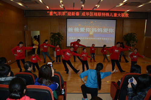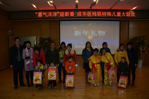 区残联学龄前特殊儿童教育康复中心2015年“喜气洋洋”迎新春大联欢于1月16日在区残联隆重举行。民革成华支委、区教育局、西南电力设计院、区特殊教育学校、爱慧特殊儿童关爱中心相关领导及学生家长、社会各界热心人士等近200人参加联欢。